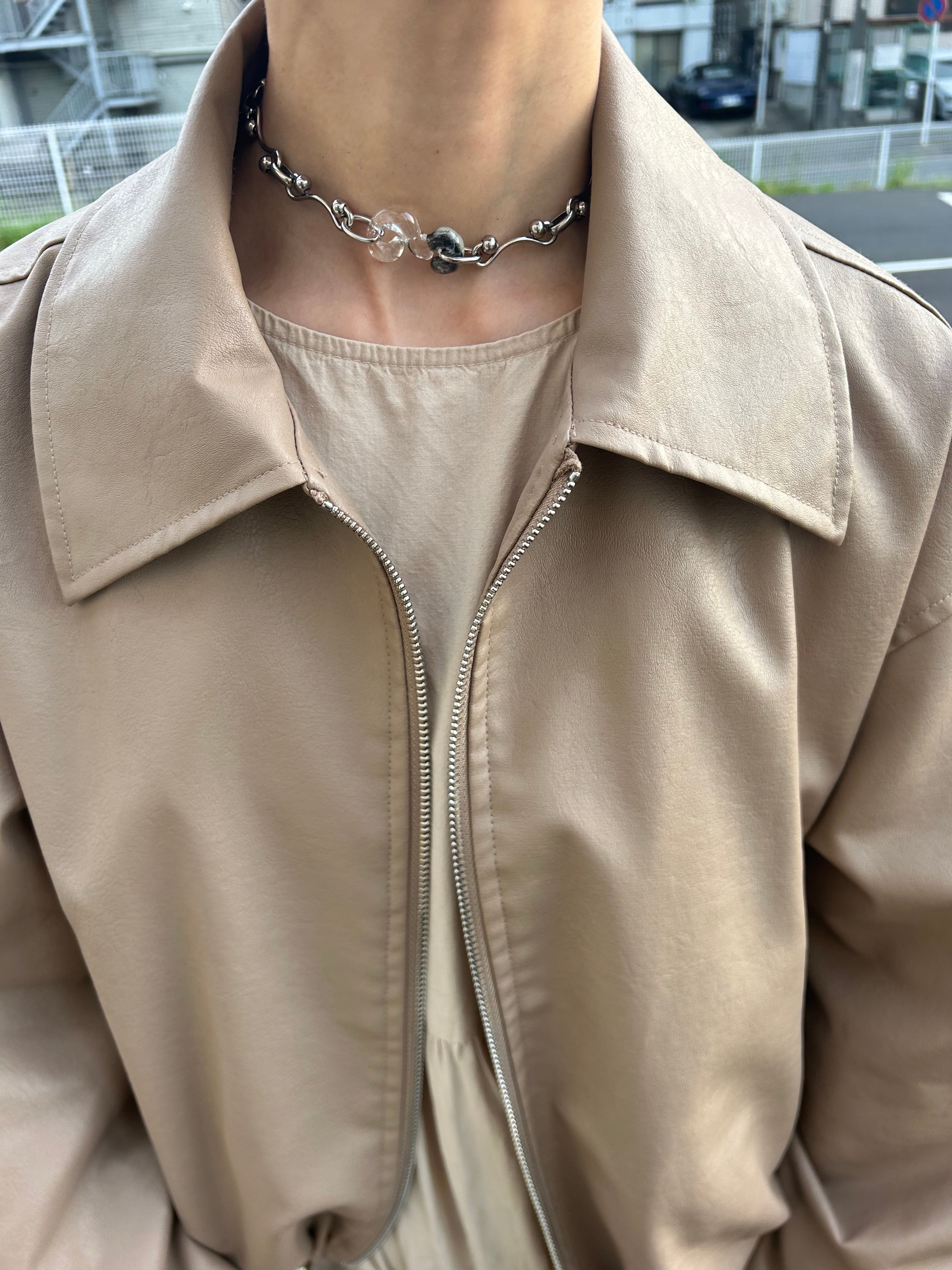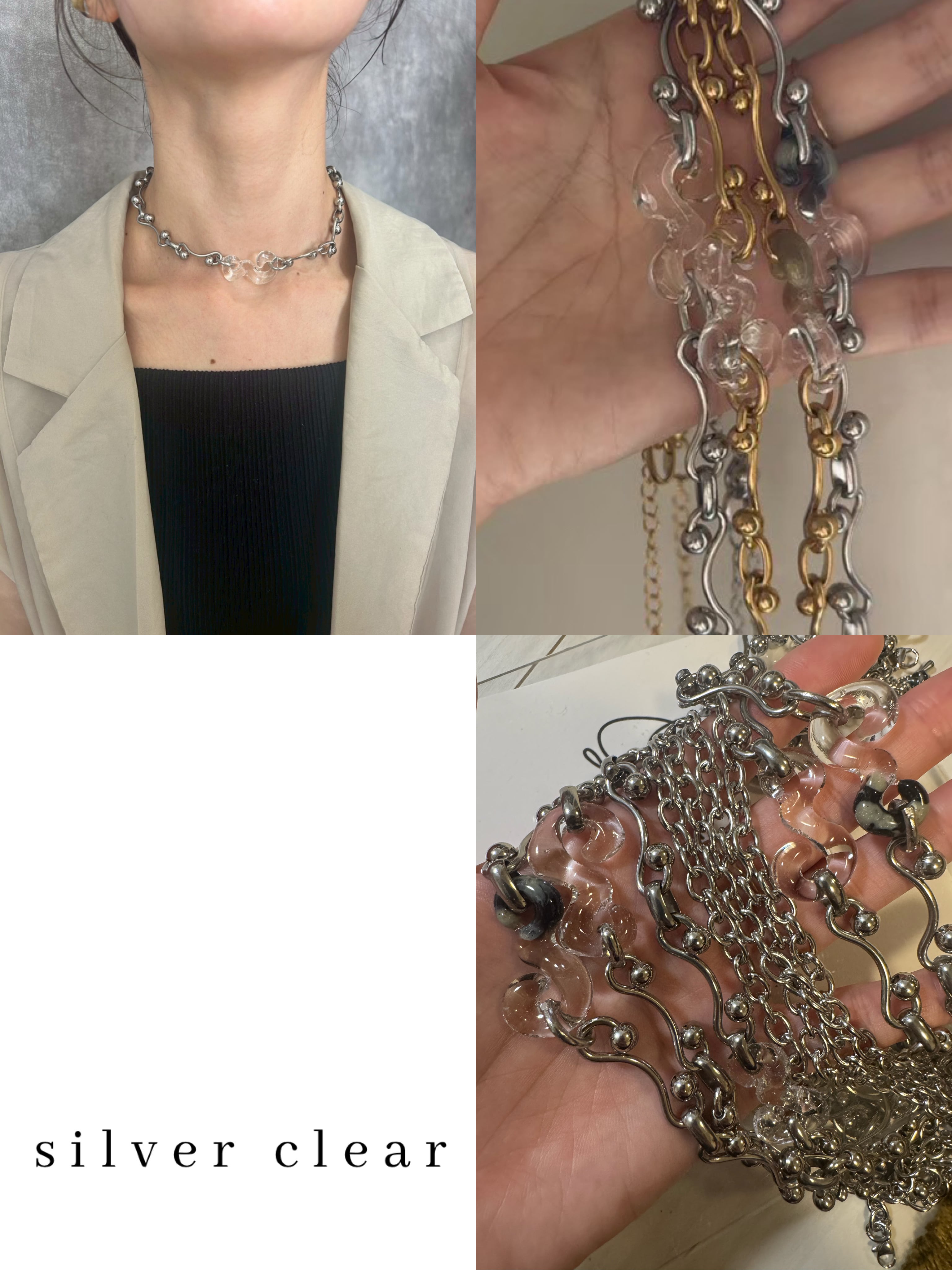 樹脂とメタル、2つの異素材を重ねたw chain necklace。